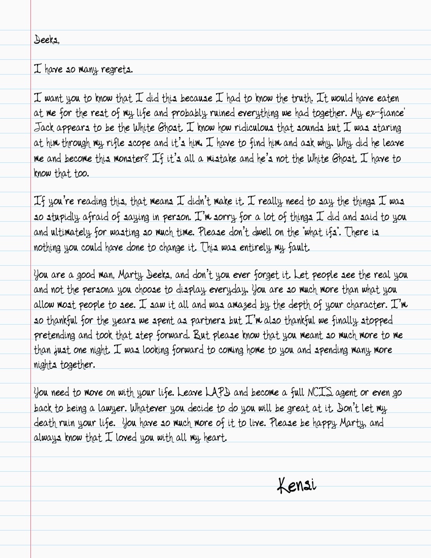 Wow, this was amazing. The dark turn taken in your latest log entry was great, and this was even more moving. Her words of encouragement to Deeks, the way she showed how much she understood and appreciated him, brought tears to my eyes. Well done.