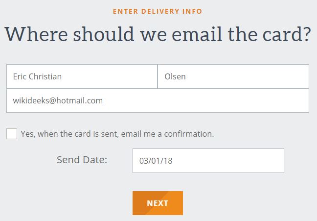 4. Enter Eric Christian Olsen’s name in the “Who should we send card to” section, along with our wikiDeeks charity e-mail: wikiDeeks@hotmail.com. (The e-mail is how we’ll know you donated.) Leave the current date in the Date to Send box. |