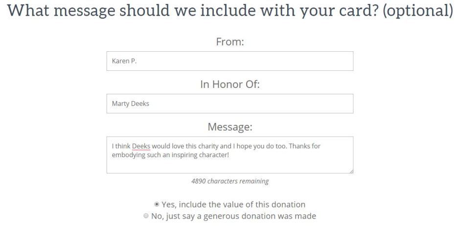 | 5. Enter your name in the “From” line, Eric’s (or Deeks’ or anyone else’s) name in the “In Honor Of” line, and leave a short message of any kind for Eric. You can write as much as 5000 characters! You don’t have to “Show how much you’re donating,” but if you do, it will help us track our cumulative impact. | ![]() |