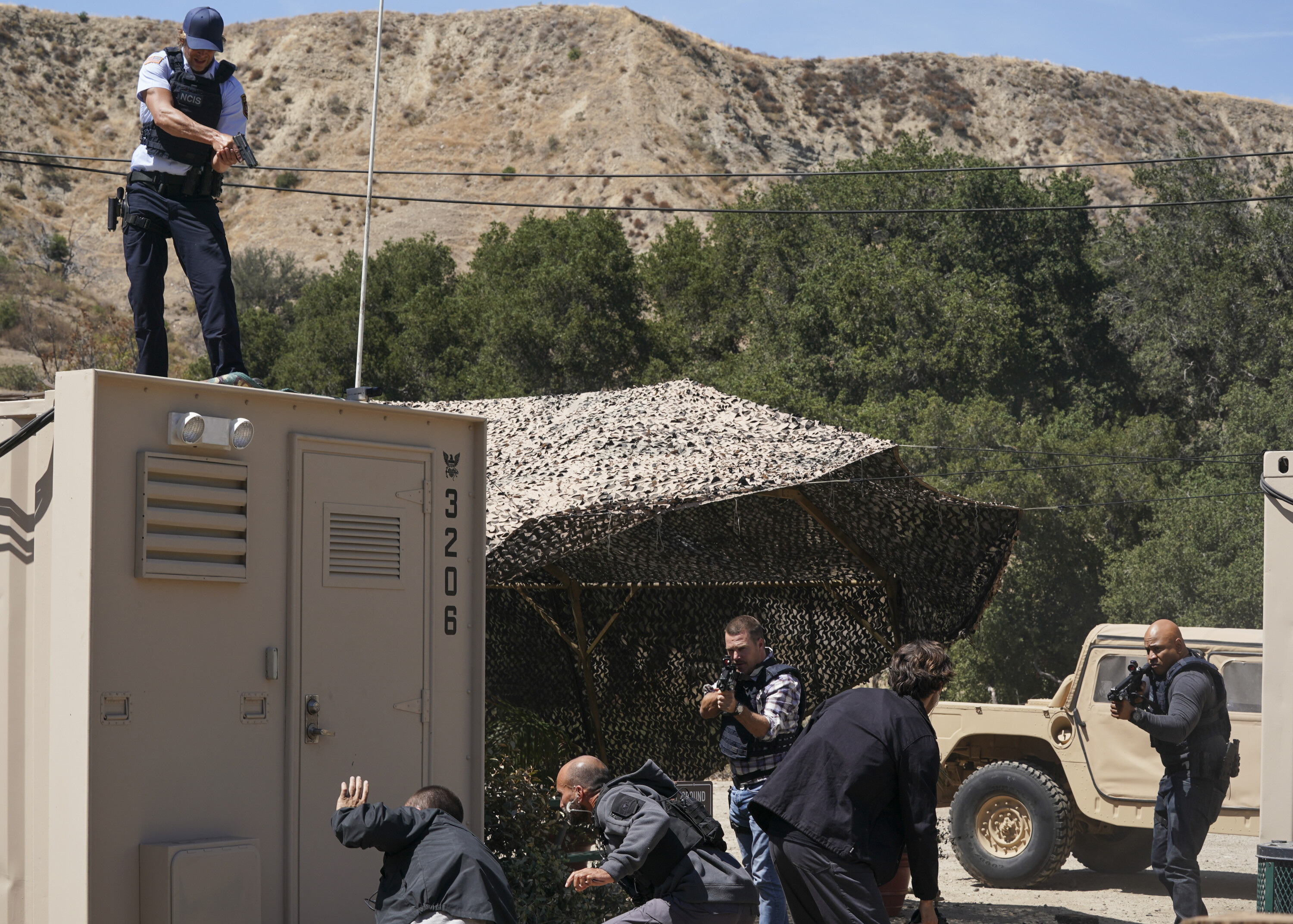 “Game of Drones” – The NCIS team searches for a suspect and their motive following the bombing of a large facility where military combat drones are assembled. Also, Callen and Kilbride get troubling news about a body found in Syria, on the 14th season premiere of the CBS Original series NCIS: LOS ANGELES, Sunday, Oct. 9 (10:00-11:00 PM, ET/PT) on the CBS Television Network, and available to stream live and on demand on Paramount+. Pictured (L-R): Eric Christian Olsen (LAPD Liaison Marty Deeks), Chris O'Donnell (Special Agent G. Callen) and LL COOL J (Special Agent Sam Hanna). Photo: Michael Yarish/CBS ©2022 CBS Broadcasting, Inc. All Rights Reserved.