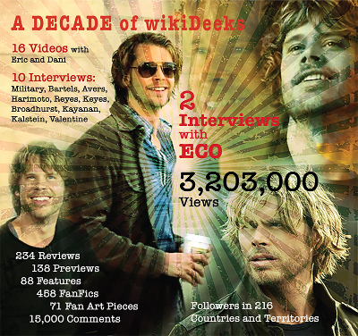 Ten years ago, I attended a NCIS Los Angeles convention in LA and met a group of Deeks devotees who agreed that our favorite detective was far too neglected and needed a site dedicated to his character and his character alone.   With that decree wikiDeeks was born!  I can’t believe it’s been 10 years and we’re still going strong.  That small group of fans grew into over 24 contributors during the course of the 10 years we’ve been in production who come together every episode to celebrate all things Deeks.  It’s been a labor of love and honor to work with them all because we were able to produce a website that we have grown proud of.  During that time, we produced year after year of material that included videos and exclusive interviews with Eric Christian Olsen, various interviews, reviews, previews, features, fanfics and fanart.