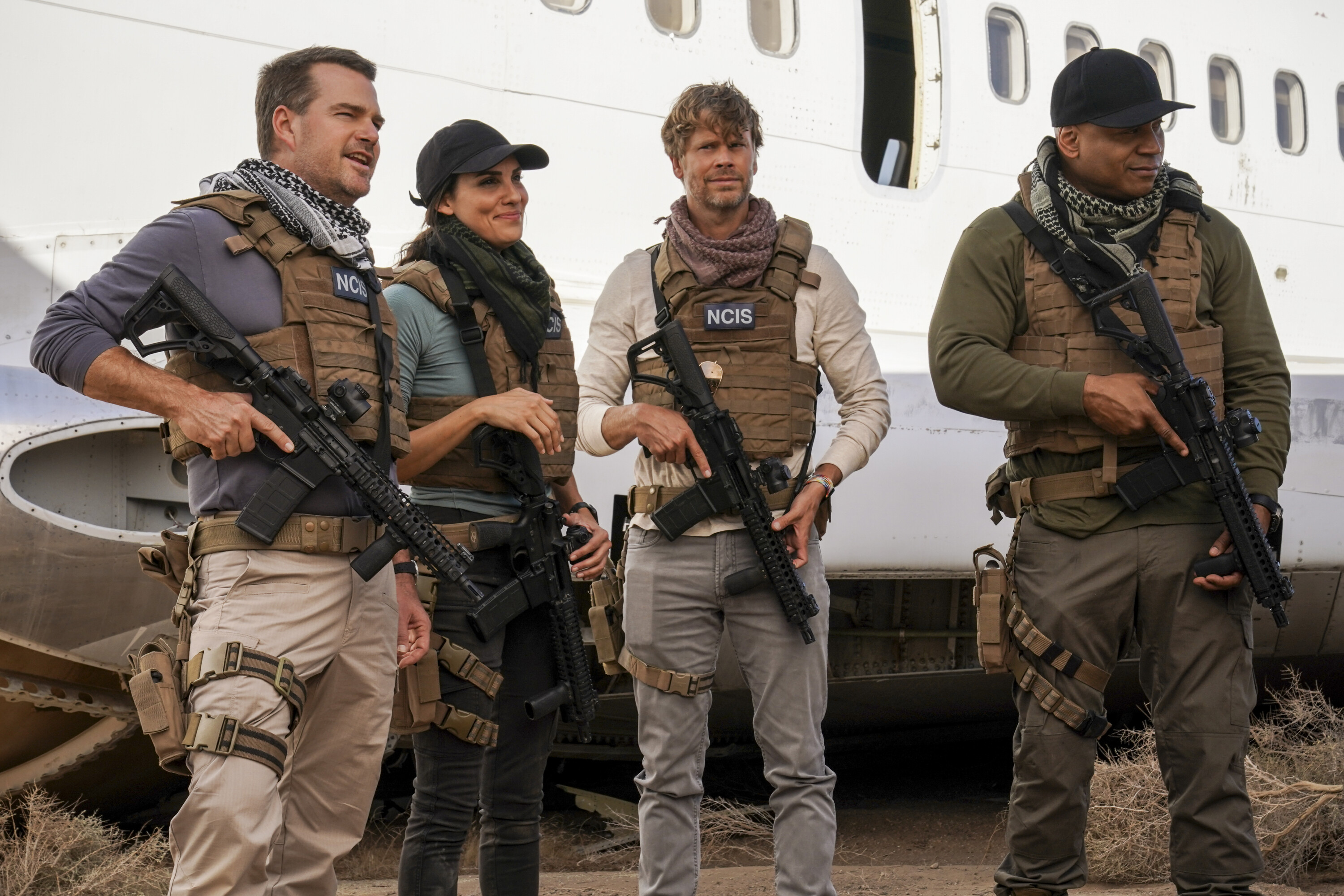 “A Long Time Coming” – Agents Rountree and Fatima are ambushed while searching for Kilbride, who has been MIA, and they learn that every member of the team has a hefty bounty on their head. The NCIS team must save Agent Rountree and find Kilbride while every cartel, hitman, gang and psychopath hunts them down, on the CBS Original series NCIS: LOS ANGELES, Monday, Jan. 9 (10:00-11:00 PM, ET/PT) on the CBS Television Network, and available to stream live and on demand on Paramount+. NCIS stars Gary Cole, Wilmer Valderrama and NCIS: HAWAI’I stars Vanessa Lachey and Yasmine Al-Bustami guest star in the episode, which is the conclusion to the three-episode crossover event with NCIS and NCIS: HAWAI’I. For the first time, NCIS, NCIS: HAWAI’I and NCIS: LOS ANGELES unite for a special three-hour NCIS crossover event for the hit CBS Original series on Monday, Jan. 9 (8:00-11:00 PM, ET/PT) on the CBS Television Network, and available to stream on Paramount. Pictured (L-R): Chris O'Donnell (Special Agent G. Callen), Daniela Ruah (Special Agent Kensi Blye), Eric Christian Olsen (LAPD Liaison Marty Deeks) and LL COOL J (Special Agent Sam Hanna). Photo: Michael Yarish/CBS ©2022 CBS Broadcasting, Inc. All Rights Reserved.